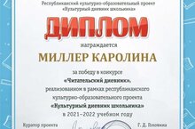 Поздравляем ученицу 2б класса, МБОУ "Уруссинская гимназия" Миллер Каролину, которая стала победителем конкурса "Читательский дневник", реализованном в рамках республиканского культурно-образовательного проекта "Культурный дневник школьника". Желаем новых побед!!!