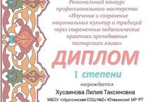 Учитель родного(татарского) языка Хусаинова Л.Т. участвовала в региональном конкурсе профессионального мастерства и награждена дипломом 1 степени в номинации "Конспект занятия", дипломом 2 степени в номинации " Самопрезентация педагога".