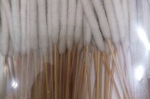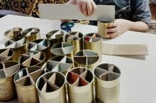 Берётся шпажка, к ней приматываются четыре обычные спички, затем всё обматывается салфеткой, закрепляется и покрывается парафином. После рнбята укладывают такие спички в коробки, дизайн и форму которых разработали совместно со своим руководителем.