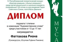 Учащаяся 9Б класса Фаттахова Риана участвовала в IV Республиканском патриотическом конкурсе «Красная ромашка», посвящённый 120-летию со дня рождения Героя Советского Союза, поэта Мусы Джалиля и в номинации "Художественное слово" заняла