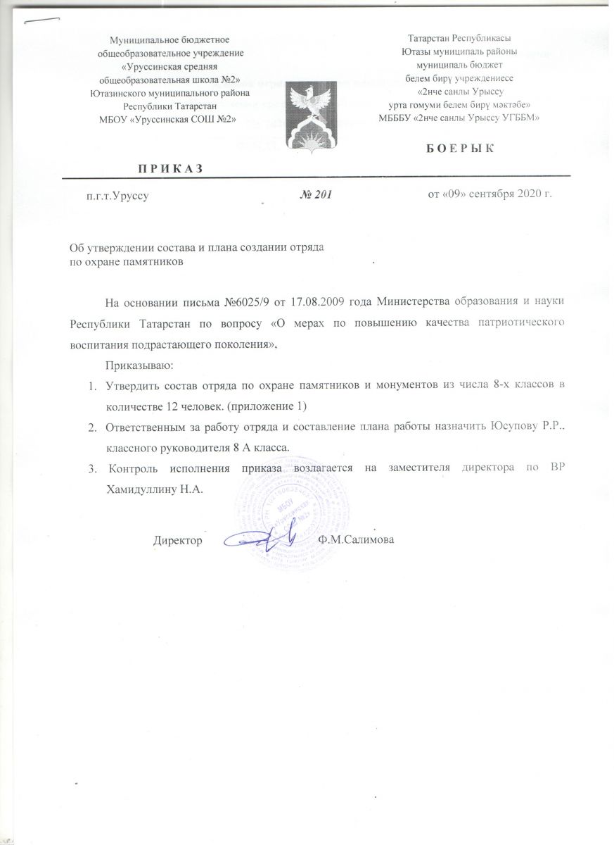Приказ №201 от 09.09.2020г. "Об утверждении состава и плана создании отряда по охране памятников" Посмотреть