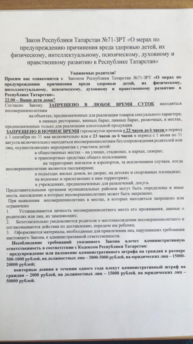 Закон Республики Татарстан №71-ЗРТ «О мерах по предупреждению причинения вреда здоровью детей, их физическому, интеллектуальному, психическому, духовному и нравственному развитию в Республике Татарстан». https://docs.cntd.ru/document/424031751 Посмотреть