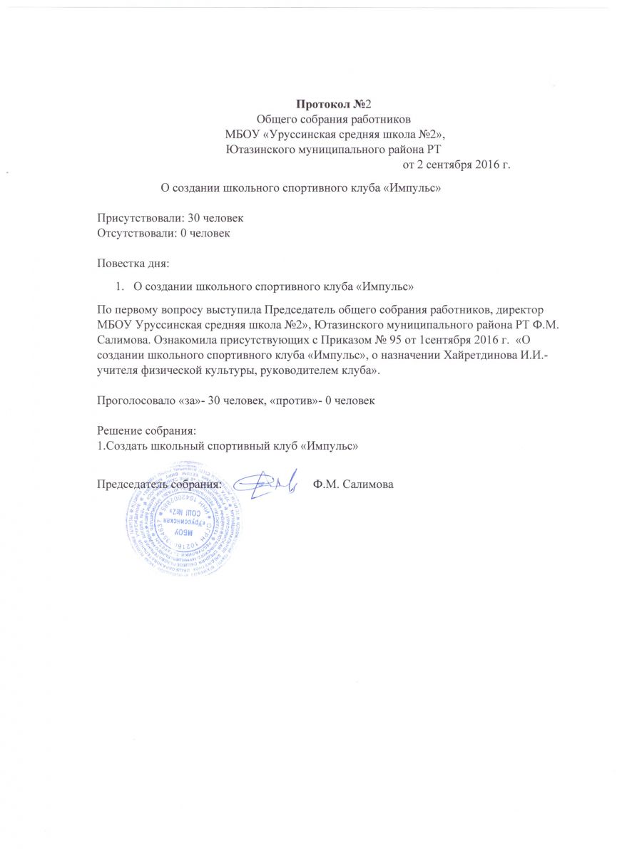 Протокол Общего собрания работников о создании ШСК "Импульс" Посмотреть