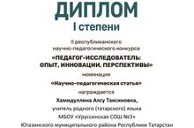 Дипломом I степени II республиканского научно-педагогического конкурса "Педагог-исследователь: опыт, инновации, перспективы" в номинации "Научно-педагогическая статья" отмечена Хамидуллина Алсу Таксиновна, учитель родного (татарского) языка 01.11.2024