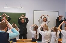 Учащиеся психолого - педагогического класса на практике применяют полученные знания и проводят динамические паузы с младшими школьниками.