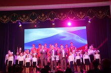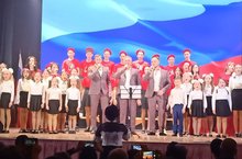 Юнармейцы школьного отряда "Факел" выступили в финале праздничного концерта, посвященного Дню защитника Отечества, с песней Олега Газманова "Россия".