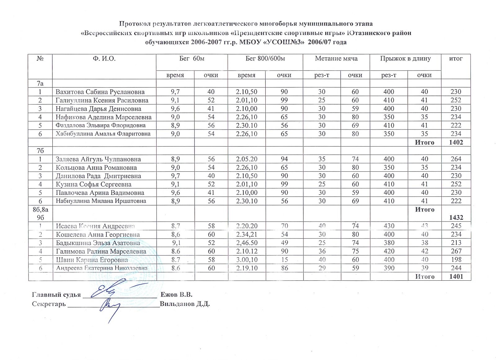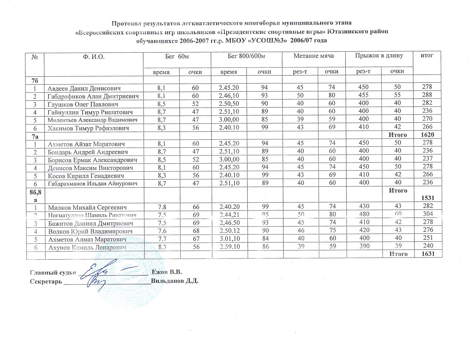 Протокол результатов легкоатлетического многоборья муниципального этапа "Всероссийских спортивных игр школьников "Президентские спортивные игры" 2021