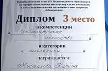 Поздравляем ученицу 8Б класса Мустахову Карину с успешным участием на Республиканском этапе VIII Национального чемпионата по профессиональному мастерству среди инвалидов и лиц с ограниченными возможностями здоровья "Абилимпикс". Выражаем отдельную благодарность учителю, подготовившего победителя, Бакировой Г.Д.