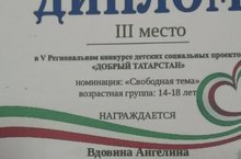 Поздравляем с Дипломами III степени ученицу 9 класса Вдовину А. и объединение "Бумеранг" в V Региональном конкурсе детских социальных проектов "Добрый Татарстан ".