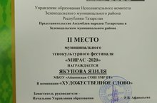 Күптән түгел шәһәребезнең 14 лицеенда ТАССРның 100 еллыгы уңаеннан “Мирас-2020” этнокультура фестивале булып узды. Фестивальнең максаты – туган телләргә, барлык халыкларның гореф – гадәтләренә мәхәббәт һәм укучыларда толерантлык хисе тәрбияләү. Быел шушы чарада мәктәбебезнең 5 нче сыйныф укучысы Якупова Язилә “Сәнгатьле сөйләм” номинациясендә үзенең көчен сынап карады. Ул халык шагыйре Фәнис Яруллинның “Татарстан байрагы” дип исемләнгән шигыре белән катнашты. Аның чыгышын жюри әгъзалары югары бәяләделәр, ул II урынга лаек булды. Язиләне шушы җиңүе белән чын күңелдән котлыйбыз. Иҗади чишмәсе саекмасын, гел челтерәп агып торсын. Алдагы бәйгеләрдә дә уңышлар теләп калабыз.