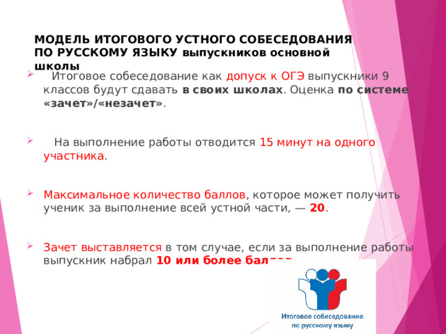 - Итоговое устное собеседование по русскому языку в 9 классе - допуск к ОГЭ;