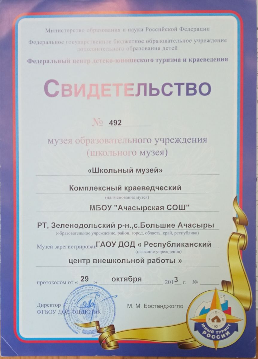 Свидительство №492 музея образвоательного учреждения (школьного музея) от 29.10.20213 г.