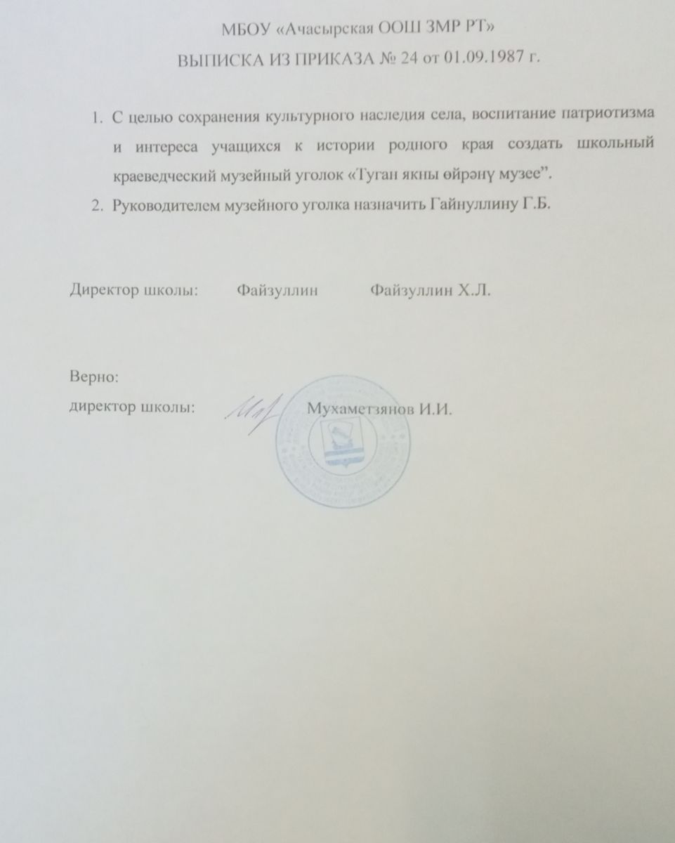выписка из приказа о создании школьного краеведческого музея №24 от 01.09.1987 г.