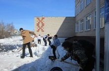 Ребята сегодня вышли на средник по уборке территории школы: собирали мусор и разбрасывали снег.