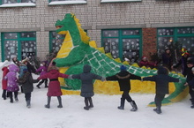 Эта работа не обошлась и без детских рук. Учащиеся старших классов вместе с учителем истории Зариповой Фанисой Файзрахмановной « оживили» Дракошу разноцветными красками, нарядили. А детвора этого только и ожидала: весело закружилась в хороводе!