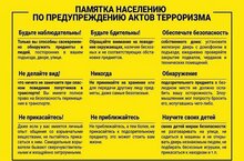 В целях повышения бдительность в предверие массовых мероприятий, а также действиях при возникновении чрезвычайных ситуаций предлагаем ознакомится с памяткой по предупреждению актов терроризма.