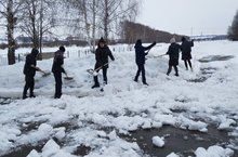 Бүген кояшлы һәм җылы көн. Мәктәбебез укучылары средникка чыктылар. Алар мәктәп территориясен кардан чистарталар. Бергә күмәк эшләү күңелле һәм җиңел. Бердәмлек таулар күчерә, ди бит халык мәкале.