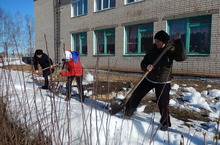 В апреле у нас начались средники и субботники по очистке территории школы от снега и мусора.