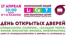 Лицей-интернат для одаренных детей с углубленным изучением химии – филиал ФГБОУ ВО «КНИТУ» приглашает на «День открытых дверей». Мероприятие состоится 17 апреля 2021 года в 10:00 часов. Администрация и педагогический коллектив лицея ответят на вопросы, касающиеся поступления, обучения и проживания. Также в этот день пройдет очный этап вступительных экзаменов.