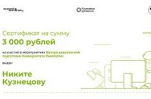 Никита Кузнецов предложил свою идею проекта и стал обладателем сертификата по профилю медиа и денежного сертификата номиналом в 3000 рублей на участие в мероприятиях Университета Иннополис. -