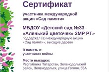 В рамках празднования 78-летия Победы в Великой Отечественной войне Министерство образования и науки Республики Татарстан проводит Всероссийскую акцию "Сад Памяти". Акция проводится в субъектах Российской Федерации в период с 18 марта по 22 июня 2023 года. Наш детский сад принял участие в данном мероприятии, высадив розы и кусты сирени. Данная акция направлена на формирование у подрастающего поколения экологической культуры и ответственного отношения к лесным ресурсам и окружающей среде, исторической памяти о победе народов России, отстоявших в Великой Отечественной войне мир без нацизма.