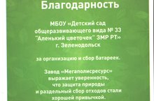 11 декабря коллектив детского сада получил Благодарственное письмо от директора завода «Мегаполисресурс» В.А. Мацюк (г. Челябинск) за организацию сбора отработанных батареек. Администрация детского сада, в свою очередь, выражает благодарность воспитанникам детского сада и их родителям за активное участие в природоохранной акции.