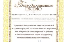 11 декабря коллективу детского сада было вручено Благодарственное письмо от правления Фонда им. Анжелы Вавиловой и администрации Казанского Хосписа за активное участие в благотворительной акции «Зеленодольские крышечки» в поддержку тяжелобольных пациентов хосписа.