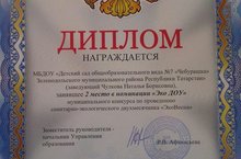 2 место в конкурсе "ЭкоВесна-2016" 30.05.2016 Поздравляем коллектив детского сада с 2 местом в муниципальном санитарно-экологическом конкурсе " ЭкоВесна -2016" в номинации " ЭкоДоу". В рамках двухмесячника были проведены следующие мероприятия: экосубботники по благоустройству и санитарии очистки территории, акция для родителей « Семейный субботник»,акция «Скворечник .Найдем дом каждому!",высадка саженцев елей и рассады, конкурс рисунков для педагогов и родителей « Мы за чистый город»,конкурс семейных фотоколлажей « Выходные с пользой", а также Эко-флэшмоб педагогов и детей. Ведь так приятно смотреть на мир, который стал красивее благодаря тебе!
