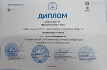 ученицу 4Б класса Малышеву Анну, занявшую 2 место в III Всероссийской (XIX Поволжской) научной конференции учащихся им. Н.И. Лобачевского в секции "Математика". Молодец! Так держать!