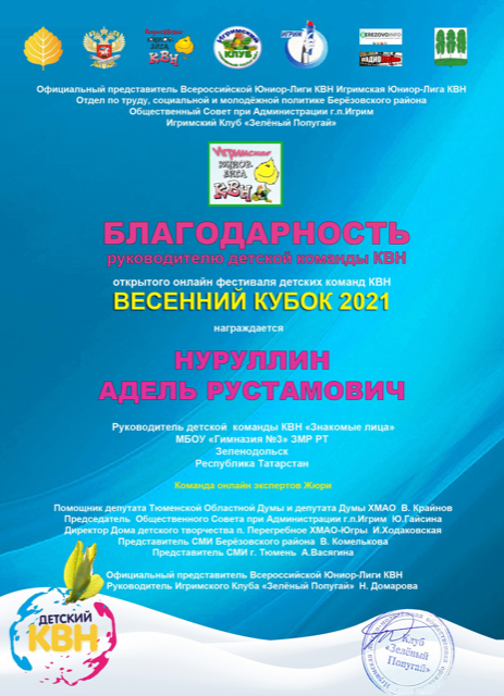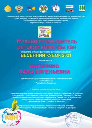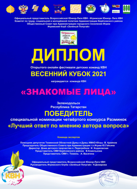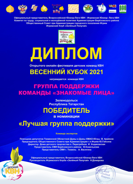 Опубликовано: 19.04.202117.04.2021 года закончился онлайн сезон 2020-2021 "От весны до весны" Игримской Юниор-Лиги, официального представителя Всероссийской Юниор-Лиги КВН. 55 команд со всей страны, 5 фестивалей, множество интересных заданий. Весь сезон в лиге играла наша команда "Знакомые лица". Ребята достойно выступили и стали обладателями значимых наград: победители сезона разминок 2020-2021 "От весны и до весны", победители в отдельных номинациях "Карта фестиваля", "Лучший актер", "Лучший ответ по мнению автора вопроса", "Лучший капитан". Руководители команды Науменко Л. и Нуруллин А. награждены благодарственными письмами. Команда выражает огромную благодарность своим болельщикам. Лучшая группа поддержки. Это дорогого стоит! Спасибо!