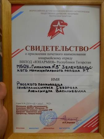 Опубликовано: 20.05.2022Юнармейцы гимназии приняли участие в V слёте Всероссийского Общественного Военно Патриотического Движения Юнармия. Юнармейскому отряду "Патриот" МБОУ "Гимназия номер 3 ЗМР РТ" присвоено почётное имя Великого Русского полководца, генералиссимуса Александра Васильевича Суворова. Нашш отряд занял 1 место по итогам IV Спартакиады среди школ Зеленодольского муниципального района! Наши активисты Ахметзянов А. и Шмарина Т. были награждены Почётной юнармейской наградой - Медаль Юнармейской доблести 2 степени.