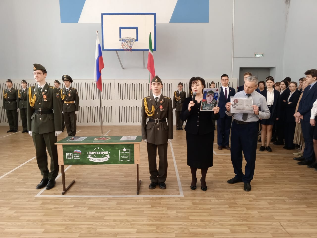 Традиционно поздравили призеров конкурсов: Тагирова А., ученика 8 класса, Адиатуллину С., ученицу 9 класса, Романова М., ученика 8 класса - победителей смотра-конкурса строя и песни "Статен в строю, силён в бою" среди юнармейских отрядов Зеленодольского муниципального района; Аглуллина Д., ученика 10 класса, капитана команды, занявшей 1 место в соревнованиях "Снайперская дуэль с элементами выживания", посвященных годовщине вывода советских войск из Афганистана и Дню Защитника Отечества.