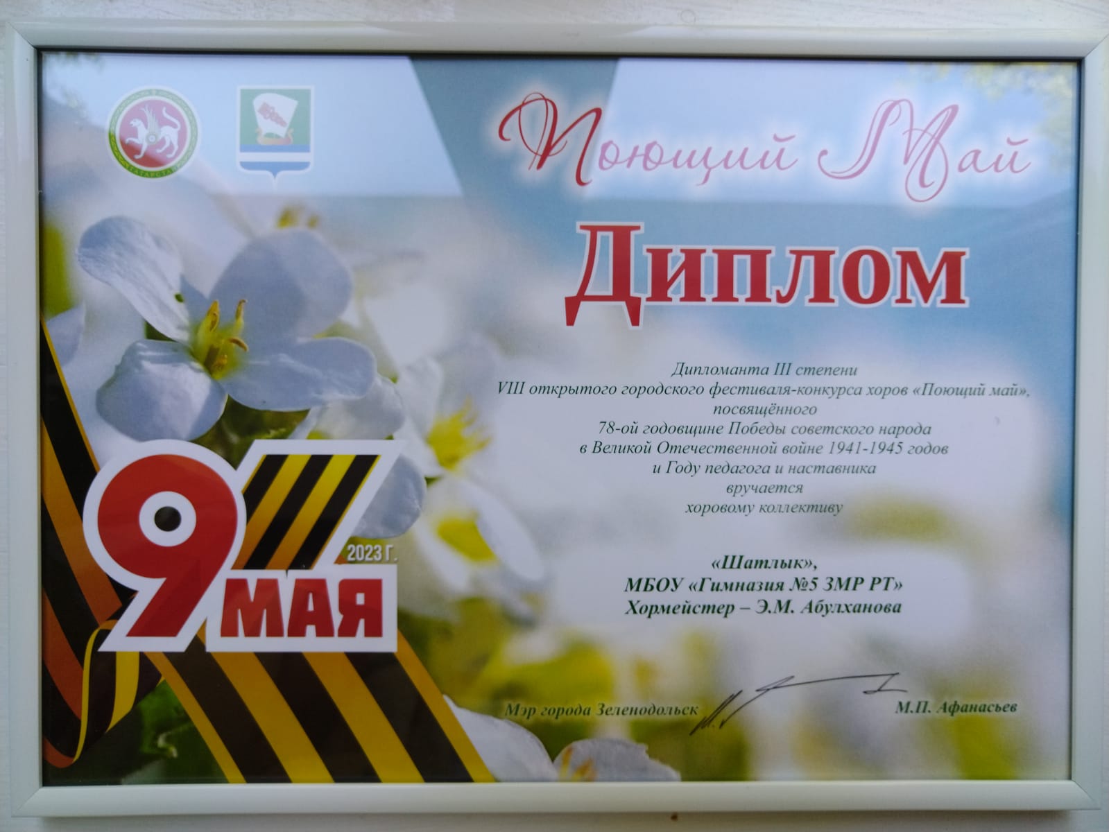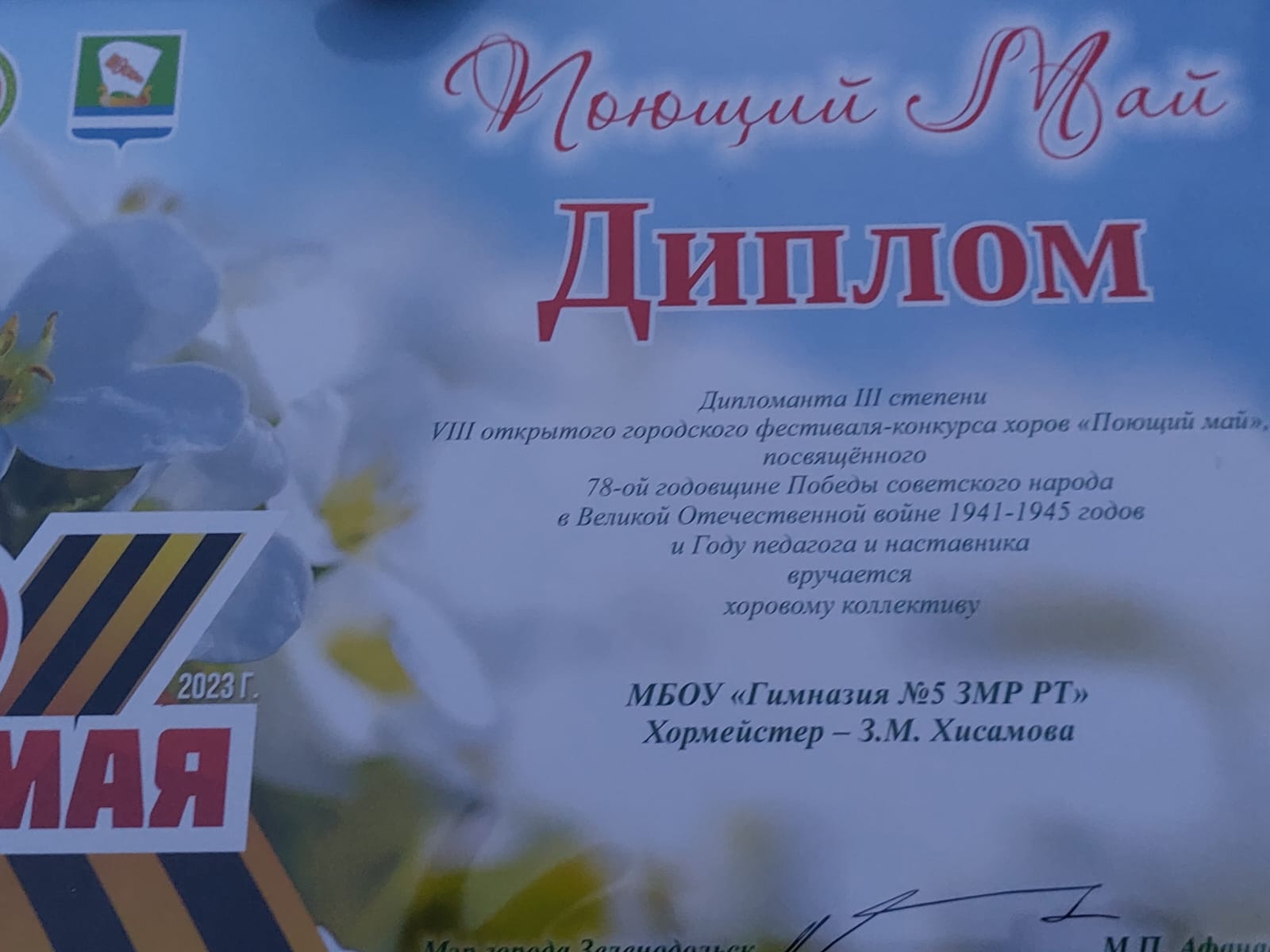 На VIII конкурсе-фестивале хоров "Поющий май" хоры нашей гимназии под руководством педагогов Эльзы Макфиевны и Зульфии Мирзаевны заняли призовые места. Молодцы!!!