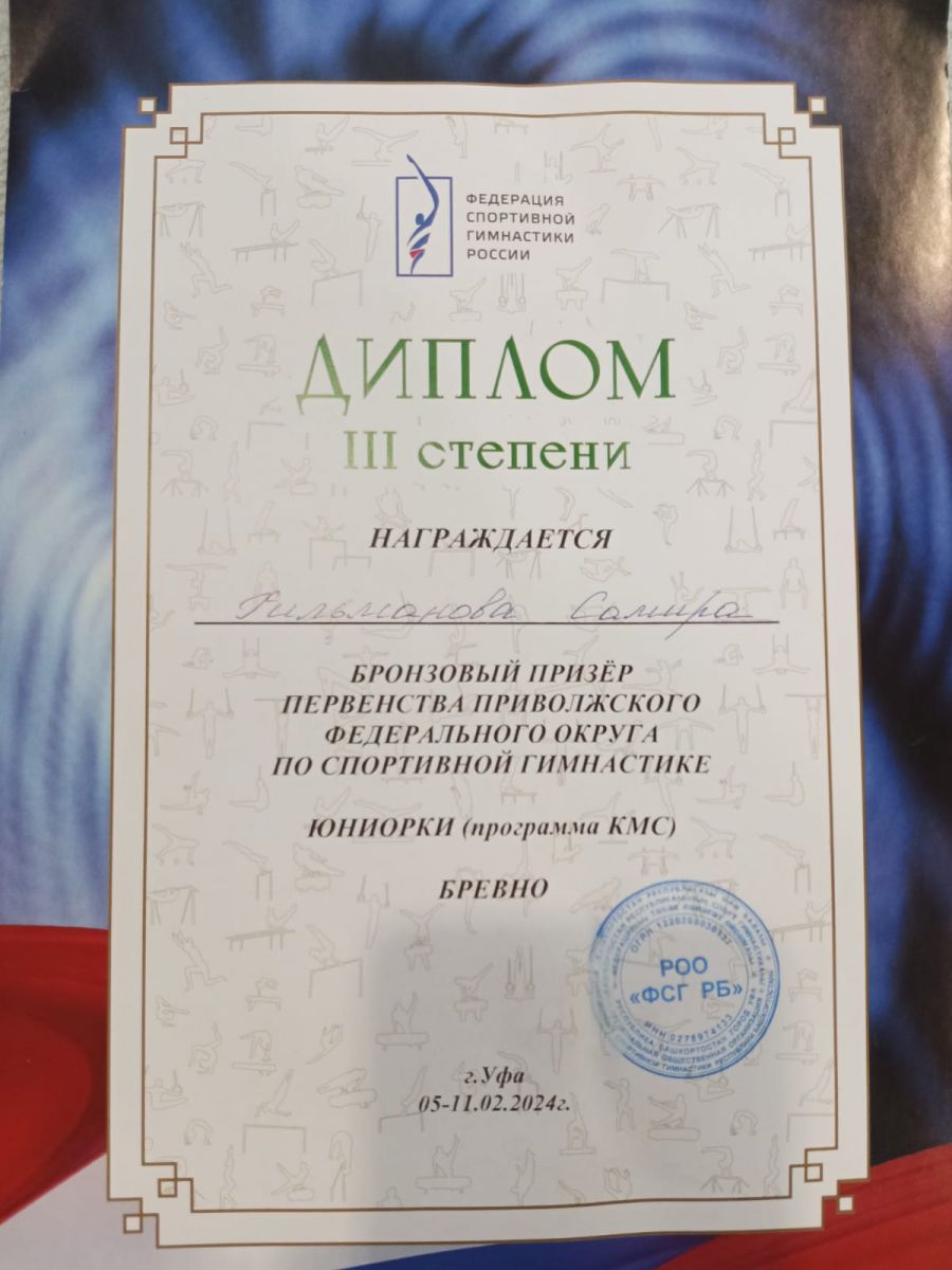 Поздравляем ученицу 6б класса Гильманову Самиру, которая стала бронзовым призером первенства приволжского федерального округа по спортивной гимнастике (бревно)!