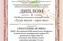Мәктәбебезнең 5 нче сыйныф укучысы Гизатуллина Ясминә Бөек Җиңүнең 75 еллыгына багышланган "Туган телем - серле тел" дип исемләнгән VII Регионара конкурста катнашып, II дәрәҗәдәге дипломга лаек булды. Котлыйбыз!