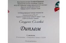 Казанның Культура институтында Татарстанның һәм Рәсәйнең халык артисты Ганиева Винера Ахатовна җитәкчелегендәге”Сандугач-Соловей”-дигән халыкара конкурсы булып узды.Лицеебызның 5нче сыйныф укучысы Миңнуллина З. I дәрәҗәле Диплом белән бүләкләнде.Әфәрин!