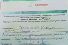Учащийся 8 Б класса Исмагилов И.(руководитель Билялов А.М.) принял участие в открытом фестивале творчества и современных технологий для обучающихся Республики Татарстан "Техника.Творчество.Успех",посвященного 60-летию со дня запуска первого искусственного спутника Земли, в г.Нижнекамске.