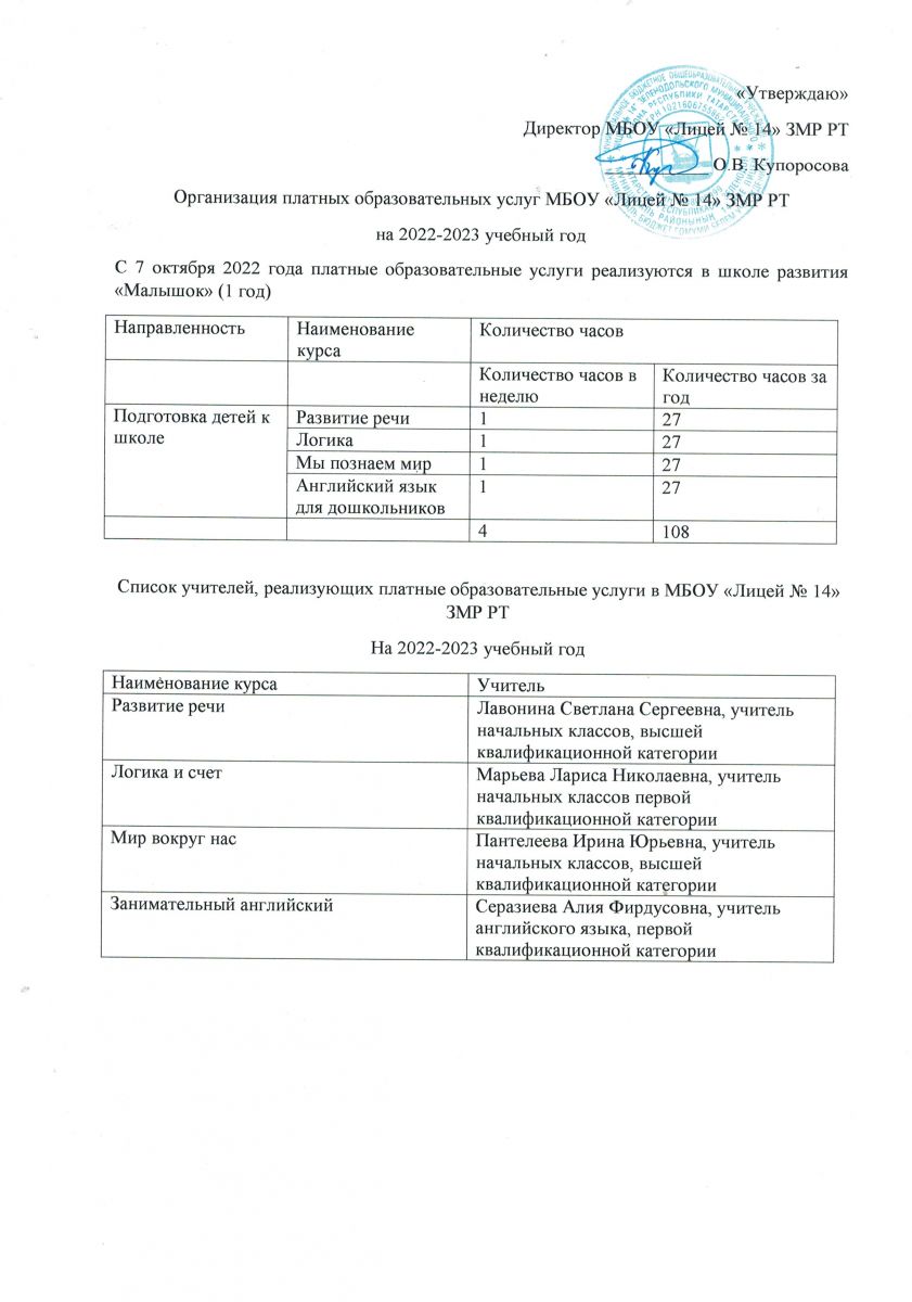 Положение о предоставлении платных дополнительных образовательных услуг в МБОУ "Лицей № 14" ЗМР РТ и распределении денежных средств, полученных от предоставления платных дополнительных образовательных услуг