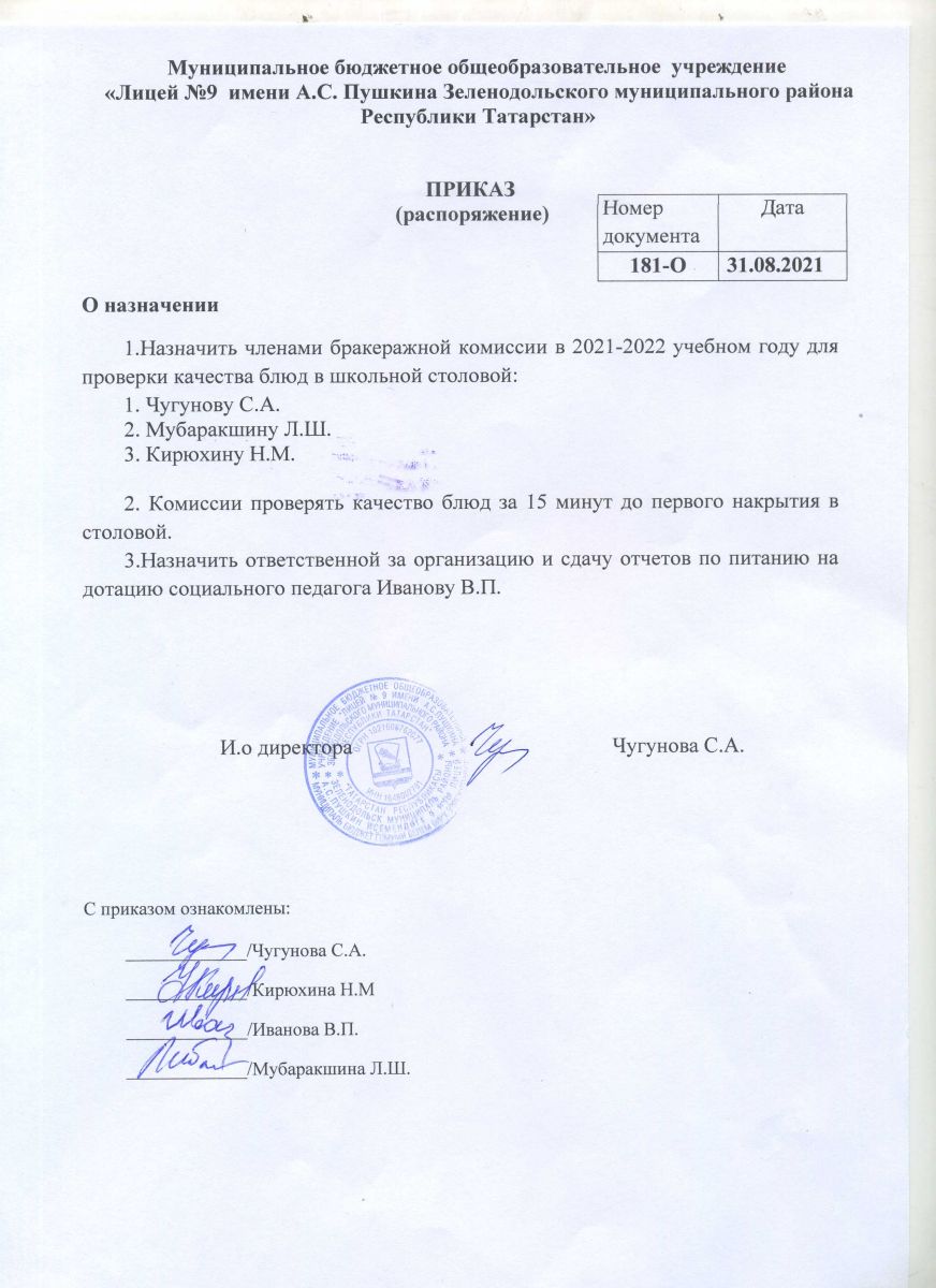 Приказ о бракеражной комиссии № 181-О от 31.08.2021г