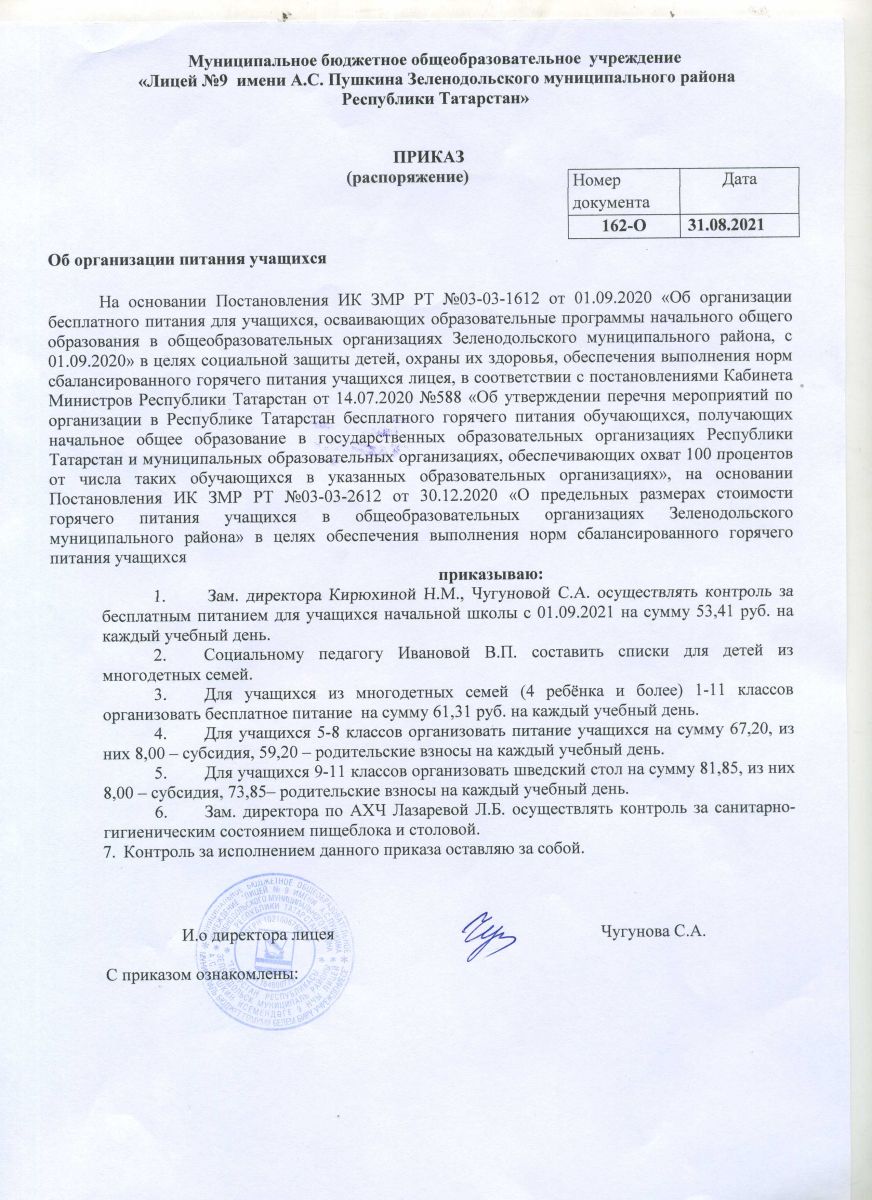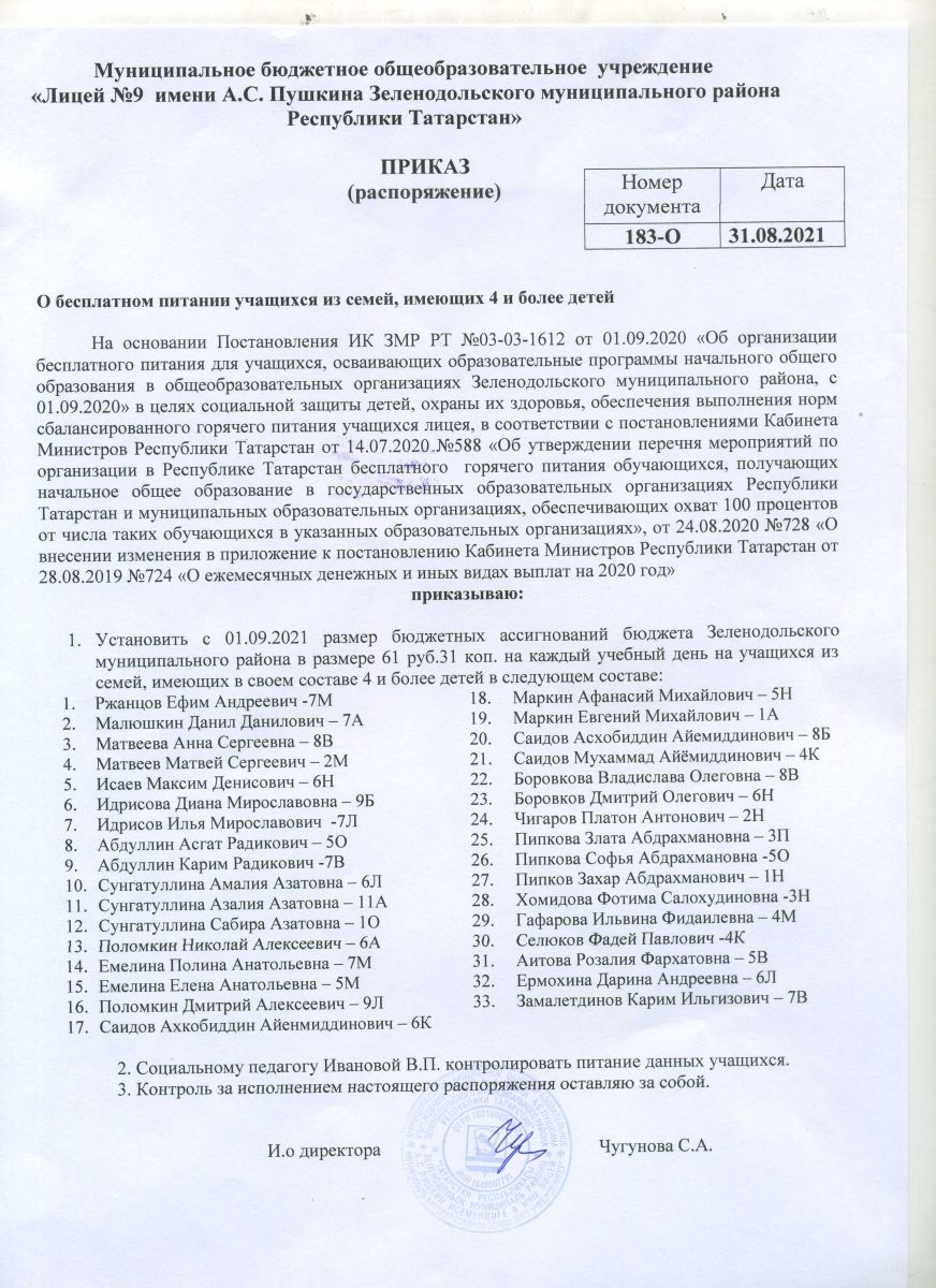 Приказ о питании учащихся из многодетных семей № 183-О от 31.08.2021г
