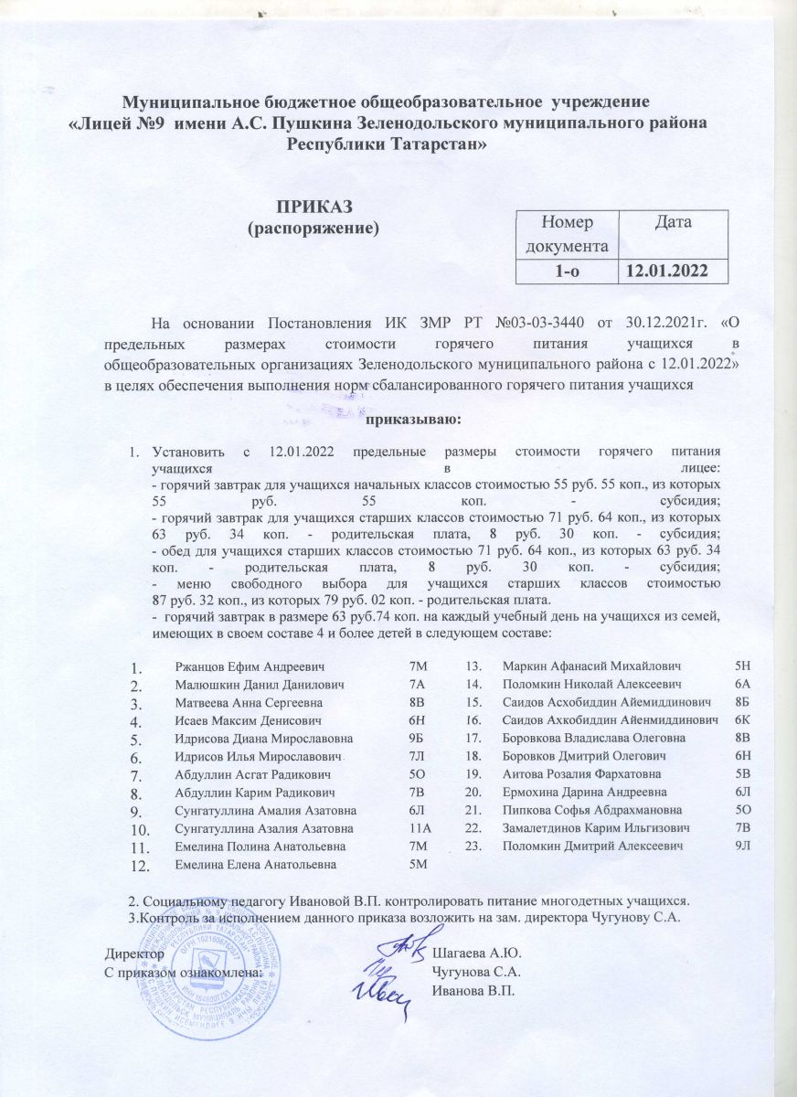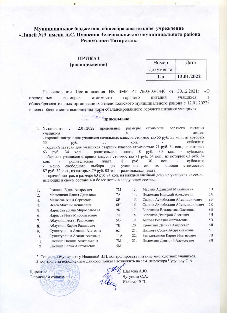 Приказ о стоимости горячего питания №1-о  от 12.01.2022г