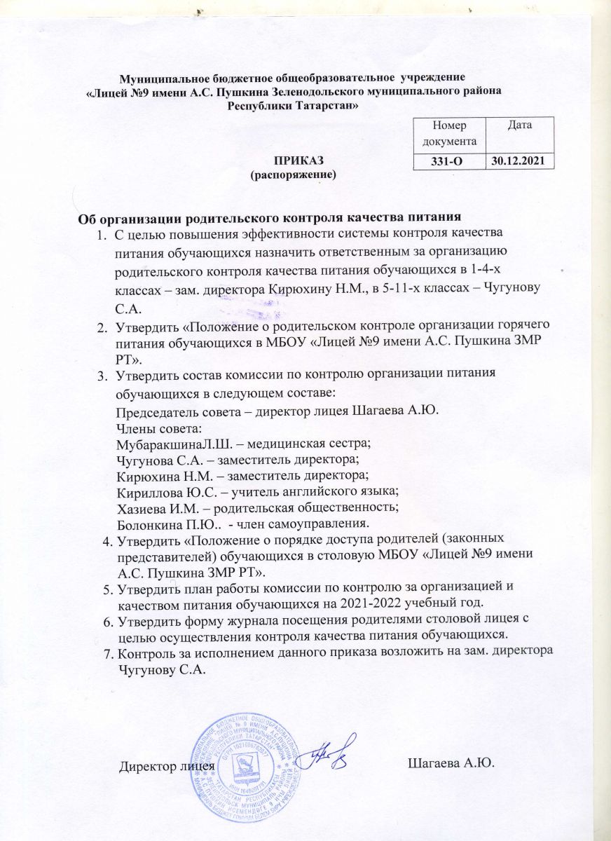 Приказ об организации родительского контроля № с331-о от 30.12.2021г