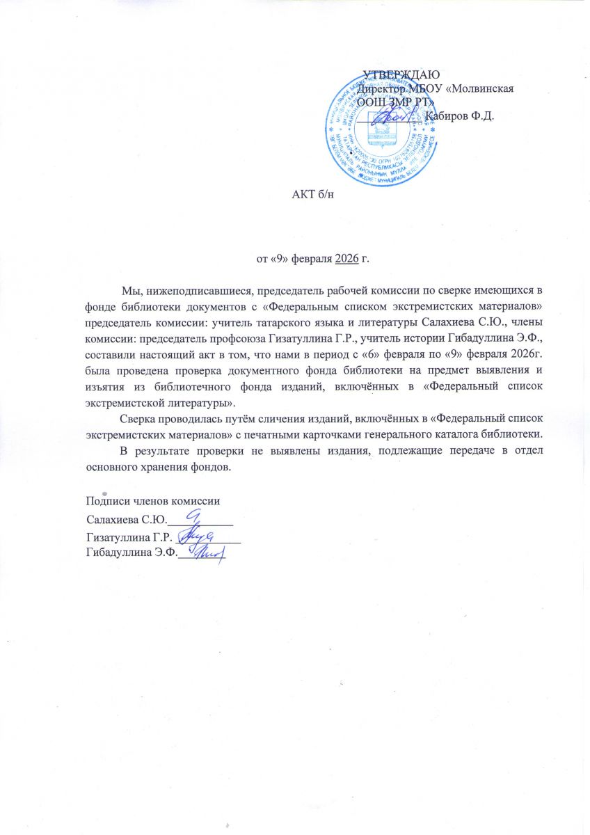 Акт проверки библиотечного фонда на наличие экстремистских изданий