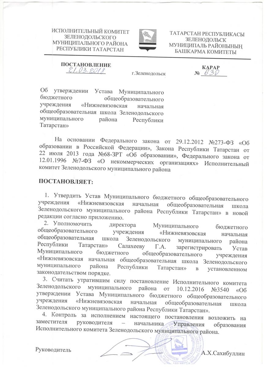 Учредительные документы: Постановление об утверждении Устава МБОУ "Нижневязовская НОШ ЗМР РТ"
