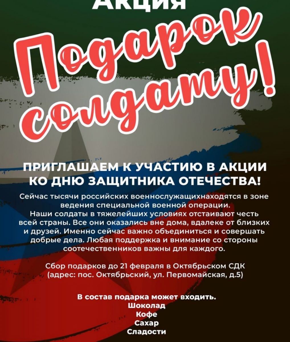 Большое спасибо всем, кто принял участие в акции "Подарок солдату". Надеемся, что помощь и поддержка помогут участникам специальной военной операции почувствовать себя немного ближе к дому и придадут им сил для выполнения боевых задач.