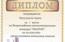 Ученики 3 класса нашей школы приняли активное и успешное участие во Всероссийском интеллектуальном конкурсе «Знаток» среди учащихся начальных классов. Среди 400 участников Мухутдинов Адель и Хасанзянов Фирдус награждены Дипломом за 1-е место по математике Дряхлов Никита занял 2-е место, Казаргельдинова Лилия, Назипов Анвар и Гребнев Егор – 3-е место, а Трофимова Алина заняла почётное 4-е место.