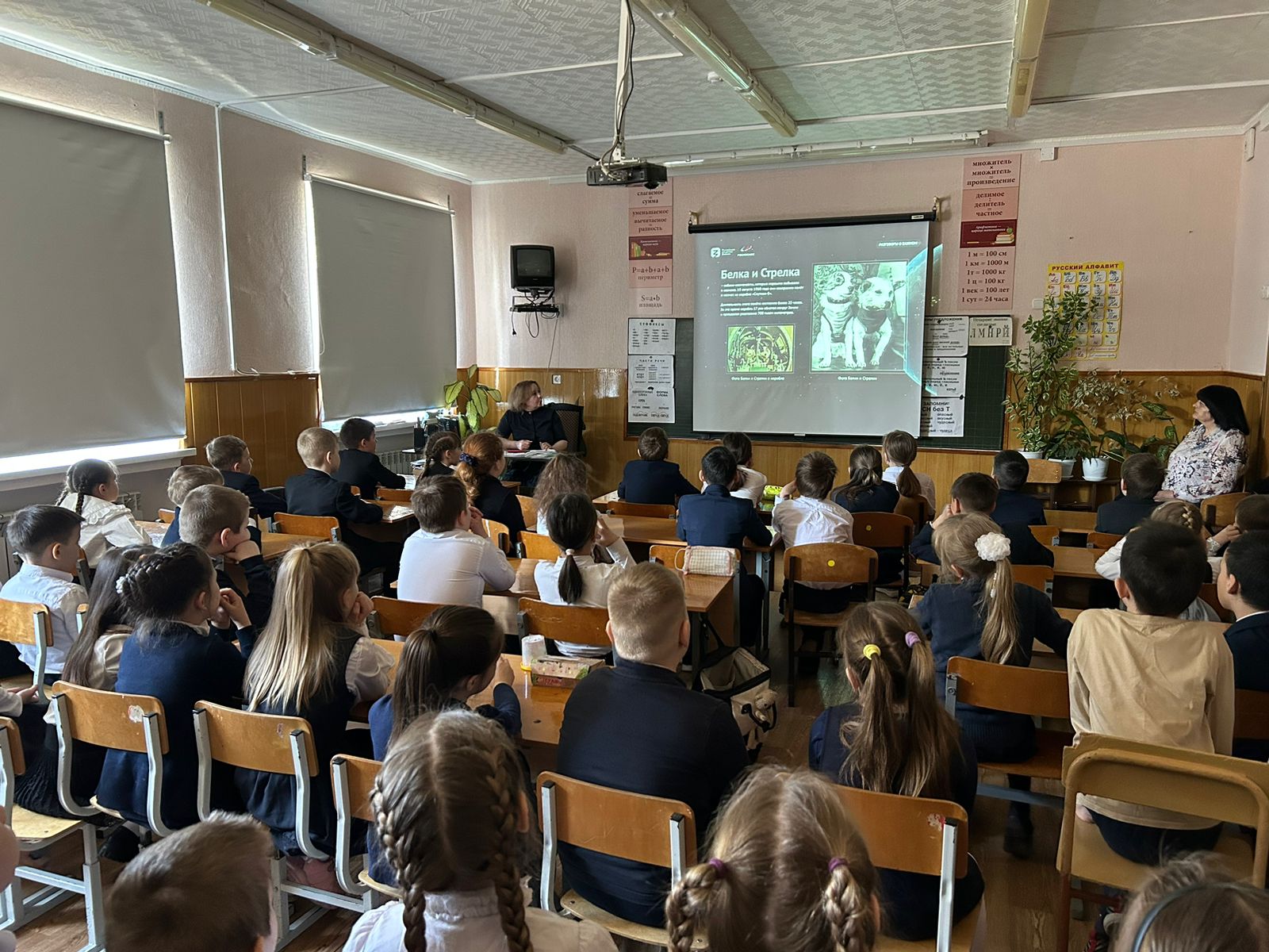 Учитель познакомил ребят с биографией космонавтов. А еще ребята узнали, что не только люди, но и животные побывали в космосе! И посмотрели видеоролик с рассказом собаки Лайки.
