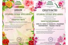 Поздравляем преподавателя художественного отделения ВДШИ Ситдикову Н.В. с вручением свидетельства о публикации во Всероссийском СМИ «Твори!Участвуй!Побеждай!» авторского материала «Лепка из глины на плоскости с рельефным изображением», а так же с победой в Международном конкурсе «Твори!Участвуй!Побеждай!»-Диплом 1 место!