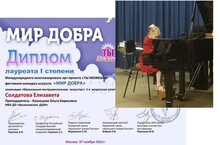Поздравляем воспитанницу музыкального отделения Васильевской ДШИ Солдатову Елизавету ( класс преп. Кузнецовой О.Б.) с победой в Международном фестивале –конкурсе искусств «Мир добра». Диплом Лауреата I степени. Желаем дальнейших творческих успехов!