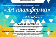 Поздравляем ансамбль скрипачей музыкального отделения ВДШИ в составе: Анисимова Дарья, Мельник Дарья, Тимергалеева Эмилия, Хакимова Ралина с успешным участием в Международном конкурсе творческих дарований «Art- платформа»-Лауреат III степени! Преподаватель Дурандина Е.Е., концертмейстер Сибгатова Д.Р. Желаем новых побед!
